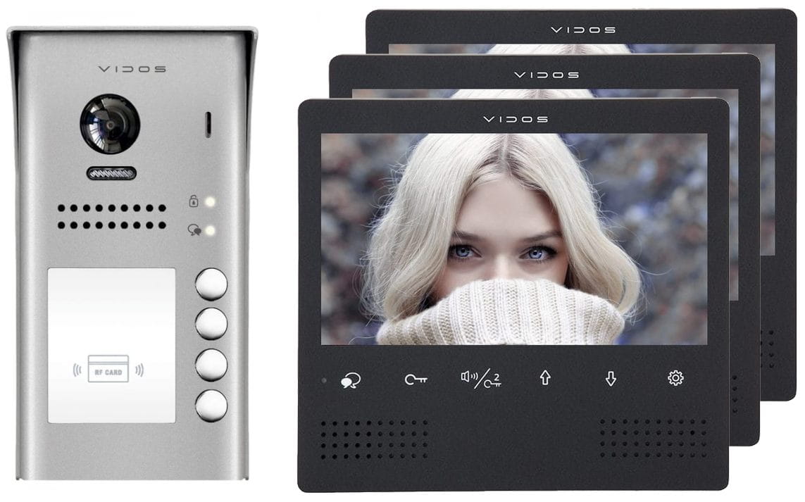 Zestaw wideodomofonowy, kolorowy marki Vidos Duo trzy monitory bezsłuchawkowe LCD 7˝, kamera z czytnikiem, otwieranie brelokami lub kartami, montaż kamery natynkowy, daszek ochronny w zestawie, doświetlenie jasnymi diodami LED umożliwia widzenie w nocy.