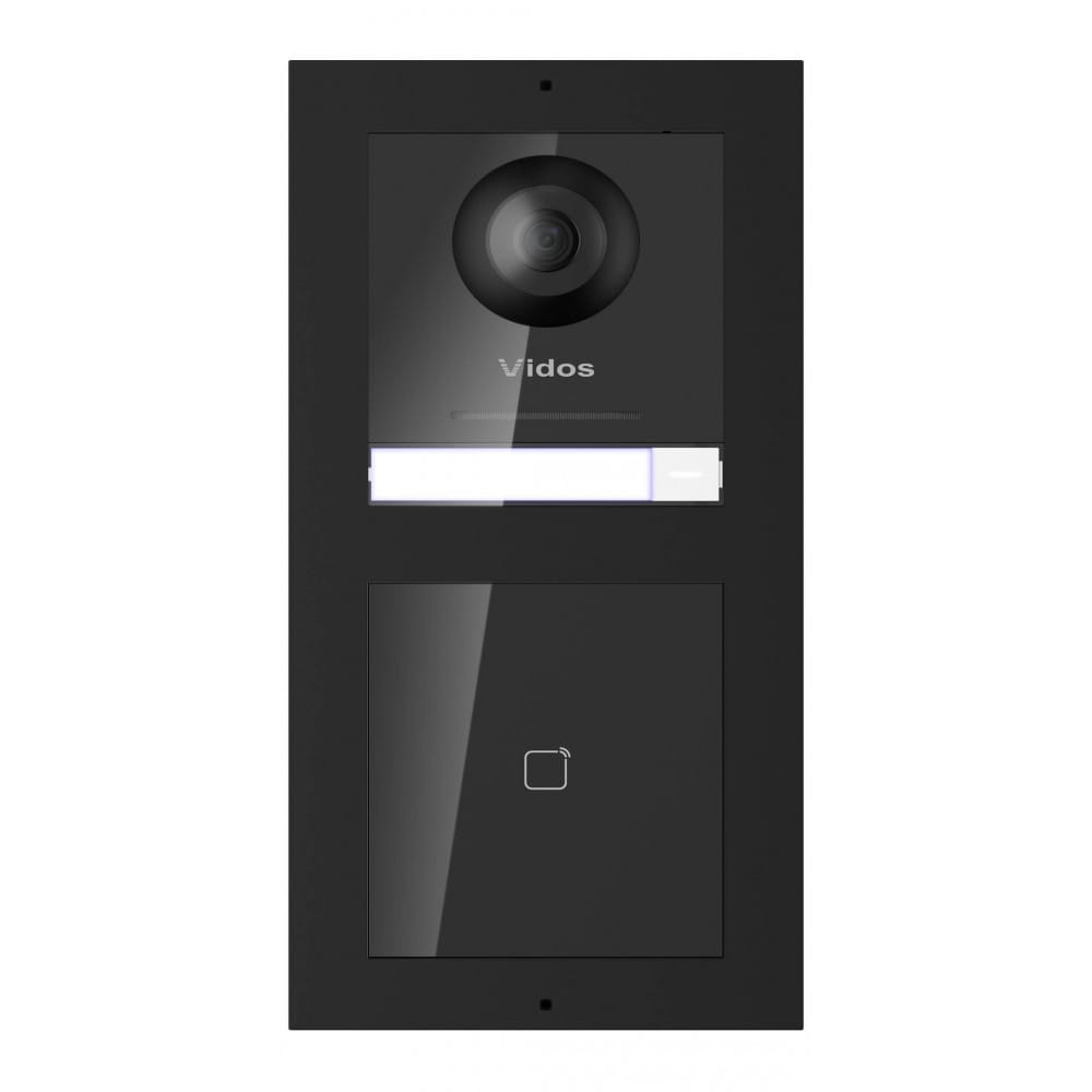 Kamera IP systemu wideodomofonwego Vidos ONE. Wbudowany czytnik zbliżeniowy kart i breloków w standardzie EM 125kHz. Wyposażony w 2 Mpx (full HD ) kamerę z obiektywem typu fisheye o kącie widzenia 180 stopni. Podświetlenie nocne LED IR pozwala na komfortowe korzystanie z urządzenia w warunkach niedostatecznej widoczności. Panel wyposażony jest w dwukierunkowy system audio z funkcją redukcji zakłóceń i eliminacji echa. Stacja bramowa posiada 4 wyjścia alarmowe, którymi można zarządzać z poziomu monitora oraz 2 przekaźniki do sterowania furtką i bramą automatyczną. Urządzenie zasilane jest w technologii PoE (IEEE 802.3af) możliwe jest również zasilanie prądem stałym 12V z zewnętrznego zasilacza. Model przeznaczony do montażu natynkowego.