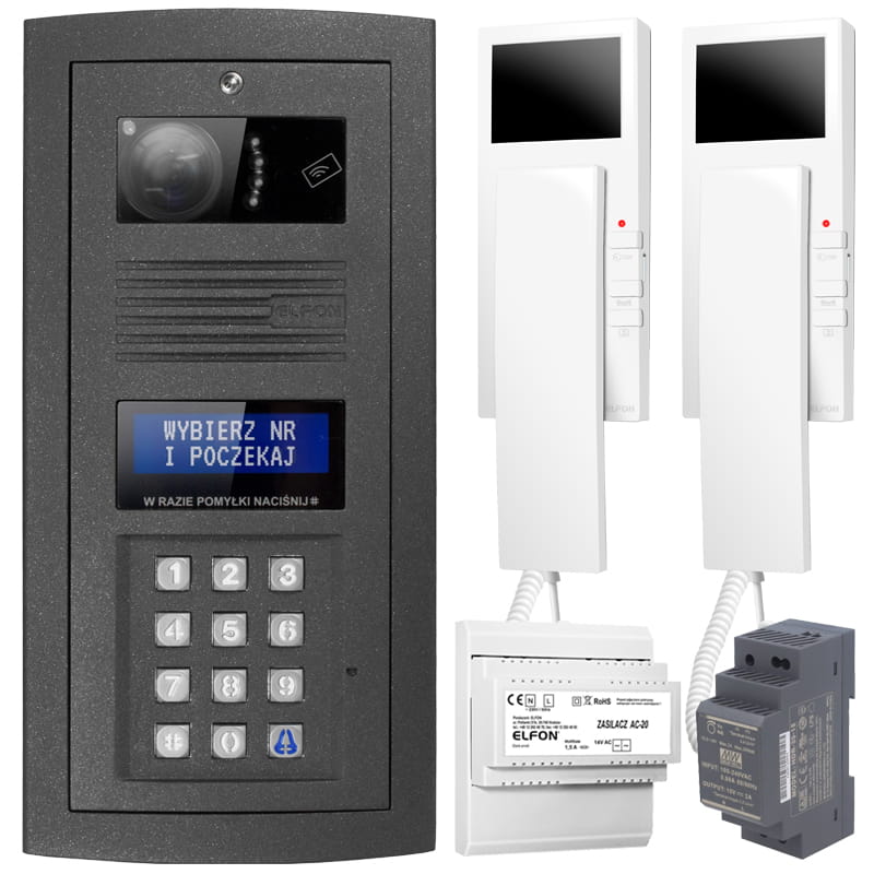 Wideodomofon cyfrowy 8-rodzinny marki Elfon Optima. W skład zestawu wchodzi kamera bramowa z czytnikiem i szyfratorem wraz osłoną (do wyboru wersja natynkowa lub podtynkowa), doświetlenie diodami podczerwieni, rozdzielczość 700 linii, regulowany kąt patrzenia. Monitory słuchawkowe z ekranem LCD 3.5", funkcja sterowania furtką oraz bramą automatyczną. W zestawie wymagane akcesoria (zasilanie, rozdzielacz sygnału video). Możliwość podłączenia maksymalnie 255 użytkowników.