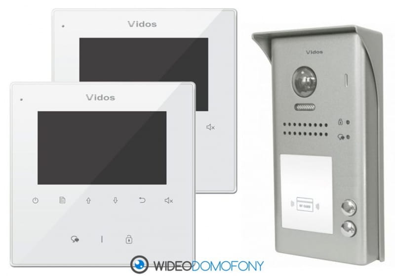 Zestaw wideodomofonowy, kolorowy marki Vidos Duo dwa monitory bezsłuchawkowe LCD 4˝, kamera z czytnikiem, otwieranie brelokami lub kartami, montaż kamery natynkowy, daszek ochronny w zestawie, doświetlenie jasnymi diodami LED umożliwia widzenie w nocy.