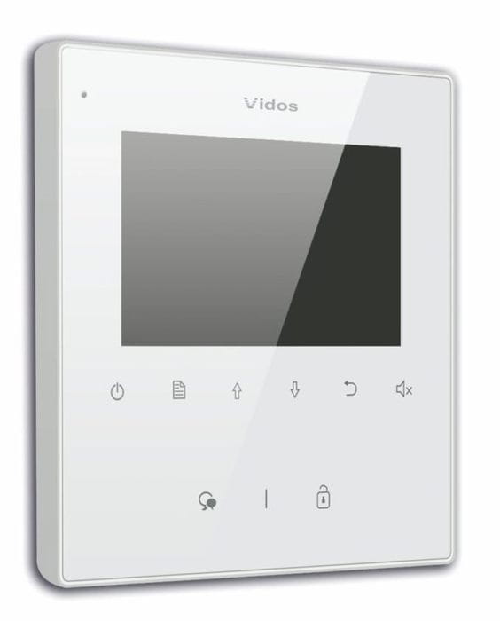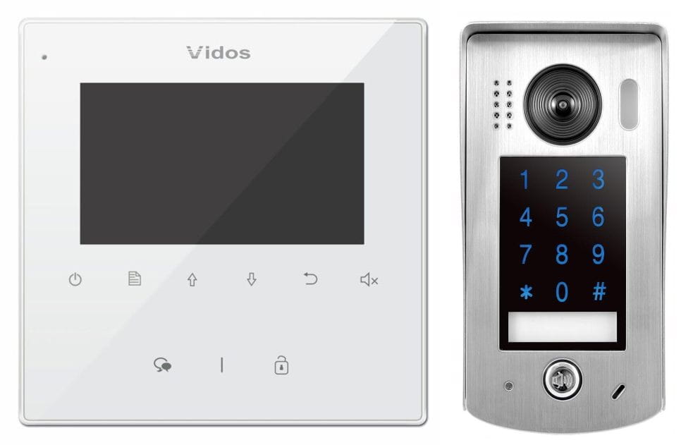 Wideodomofon dwużyłowy Vidos Duo do domu jednorodzinnego. W skład zestawu wchodzą: monitor kolorowy z wyświetlaczem LCD 4.3", funkcja otwierania furtki oraz bramy automatycznej, interkom, kamera jednorodzinna przeznaczona do montażu natynkowego, wbudowany zamek kodowy szyfrator, szerokość kamery 93 mm, rozdzielczość 2 Mpix, kąt patrzenia 170 stopni, zasilacz DIN.