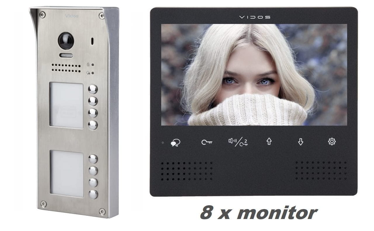 Zestaw wideodomofonowy, kolorowy marki Vidos Duo monitory bezsłuchawkowe LCD 7˝, kamera 8 przyciskowa z czytnikiem, otwieranie za pomocą breloków i kart zbliżeniowych, montaż kamery natynkowy, daszek ochronny w zestawie, doświetlenie jasnymi diodami LED umożliwia widzenie w nocy, funkcja interkomu pomiędzy monitorami